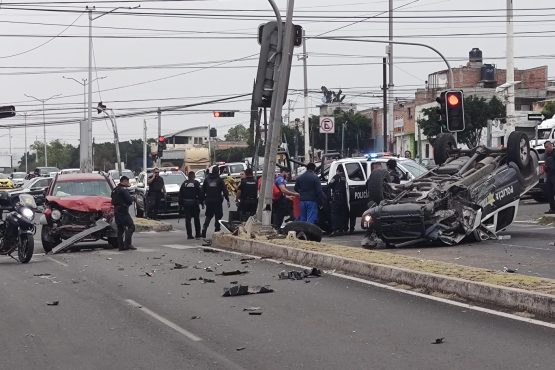 Aparatoso choque por semaforazo entre patrulla y una camioneta particular